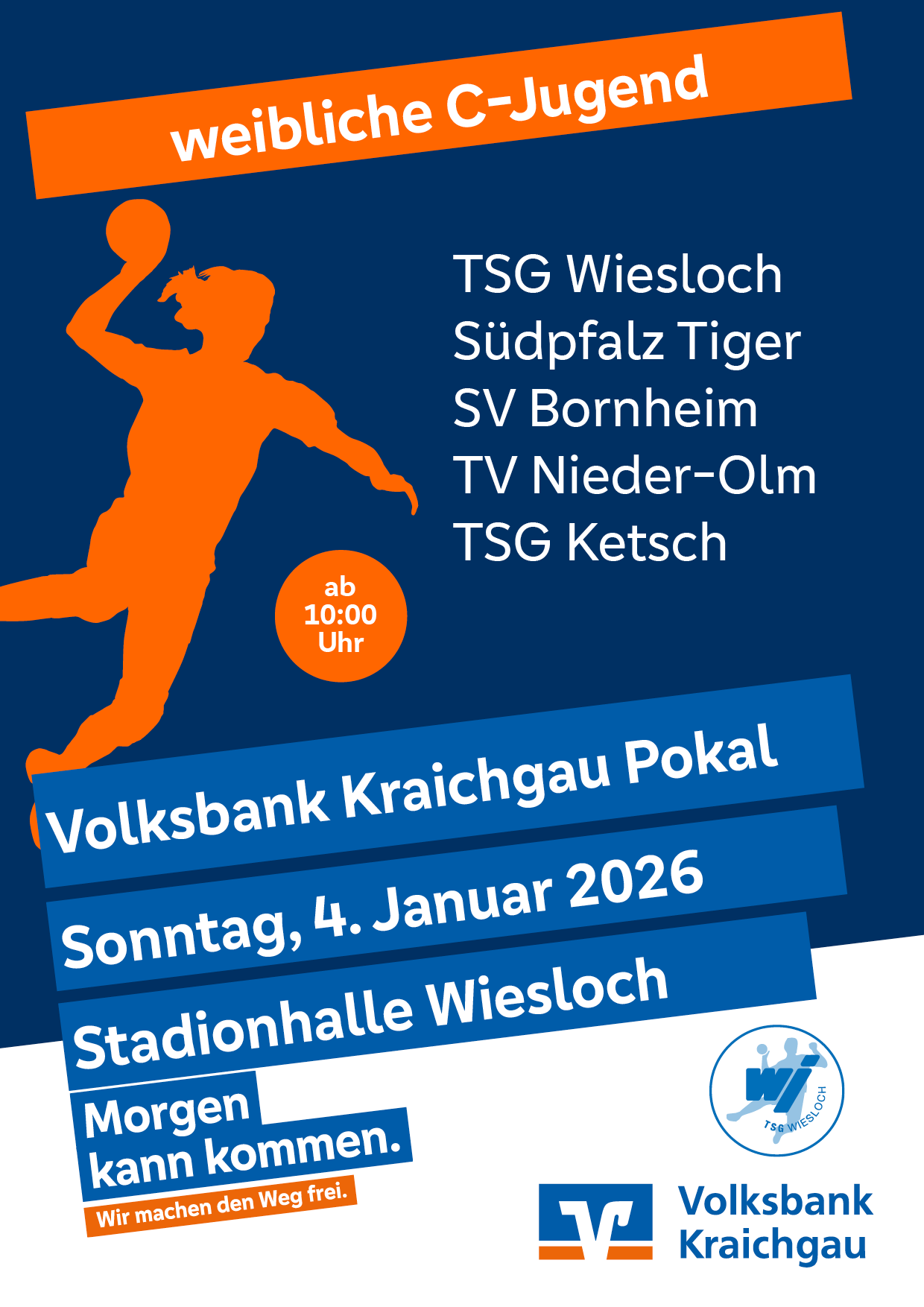 Bewerbungsfrist verlängert: Bewerbt euch noch bis Ende November für den Volksbank Kraichgau Pokal für weibliche C-Jugenden! Wir freuen uns sehr, bekanntzugeben, dass wir den Volksbank Kraichgau Pokal auch im Jahr 2026 wieder austragen!Zum ersten Mal richtet die TSG Wiesloch Handball das Turnier für weibliche C-Jugend-Mannschaften aus den umliegenden Verbänden aus – wir freuen uns auf spannende Spiele und tolle Teams!