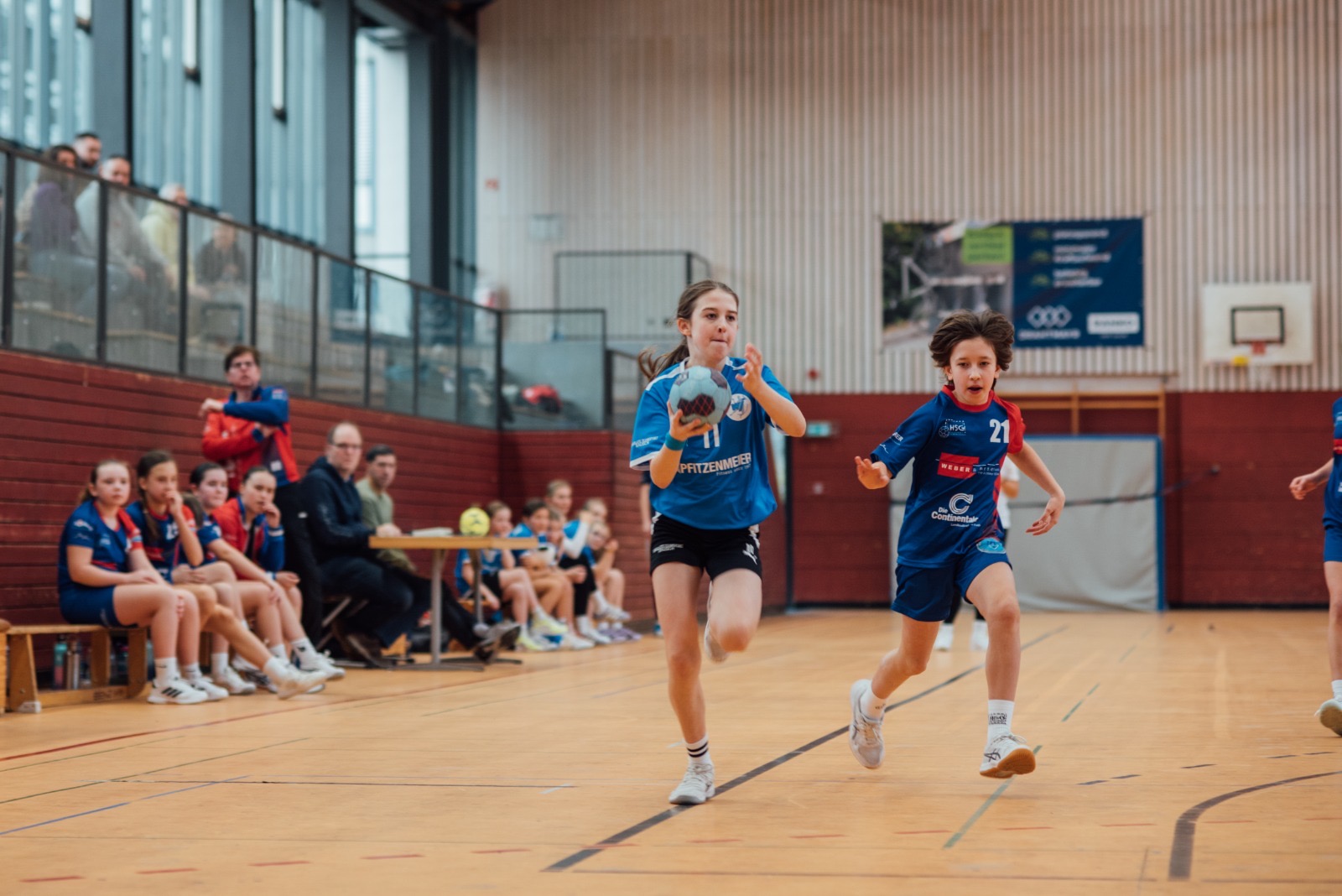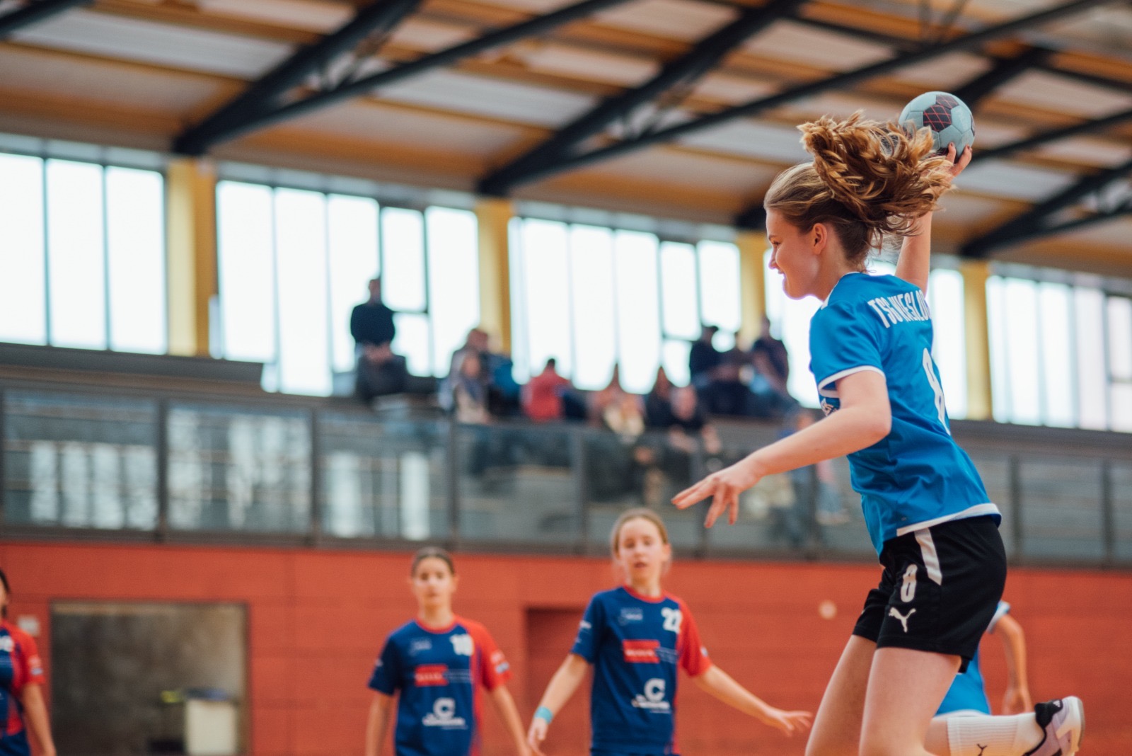 Von Anfang an starteten die Mädels mit voller Energie in das letzte Heimspiel der Saison. Nach knapp drei Minuten stand es bereits 4:2, was die hohe Anfangsschnelligkeit unterstrich. Daraufhin kam die TSG in Fahrt: Eingeläutet durch einen Treffer von Frederike Hahne, konnten sie einen 8:0-Lauf für sich verbuchen. Mit schnellen Ballgewinnen in der Abwehr und konsequenten Torabschlüssen stand es nach zehn Minuten 17:3. Besonders hervorzuheben ist das Zusammenspiel der Mädels und der Blick füreinander – das hat heute wirklich herausragend funktioniert! Im weiteren Verlauf der ersten Halbzeit ließen die Mädels der TSG nicht nach und konnten die Abwehr der HSG immer wieder überwinden. Den letzten Treffer der ersten 20 Minuten für die TSG erzielte Lara Schumm, sodass sie mit einer 26:10 Führung verdient in die Halbzeit gingen. In der Halbzeit war die Devise, an die Leistung der ersten Halbzeit anzuknüpfen und insbesondere das Zusammenspiel der Gegenrinnen mit dem Kreis zu unterbinden. Die ersten beiden Treffer der zweiten Hälfte gehörten der HSG, bevor die Wieslocherinnen wieder Tempo aufnahmen und ihre Führung von 26:13 zu 32:13 ausbauten. In der Abwehr war die Ordnung zwischenzeitlich etwas verloren gegangen, jedoch konnten die Pässe zum Kreis der HSG erfolgreich verhindert werden. Dabei unterstützte Torhüterin Hanna Schmid mit wichtigen Paraden und stärkte so die TSG-Abwehr. Die letzten Spielminuten