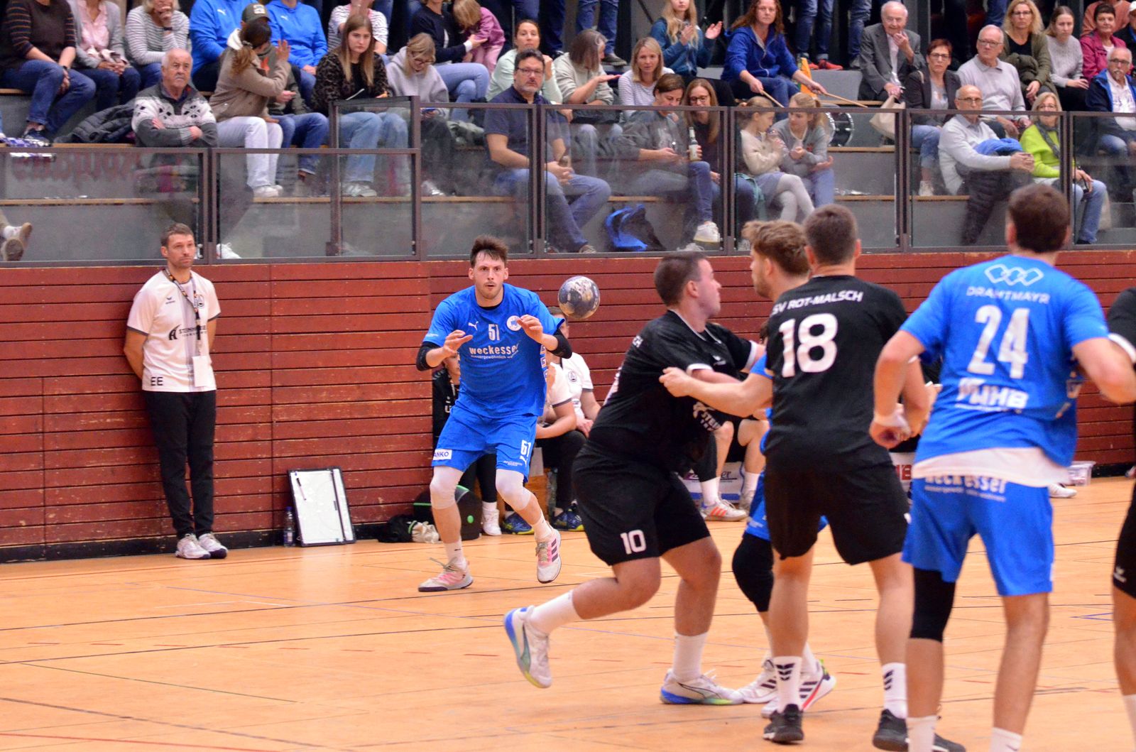 Auch nach dem Seitenwechsel blieb das Duell intensiv und ausgeglichen. Keine der beiden Mannschaften konnte sich entscheidend absetzen, und 15 Minuten vor Schluss stand es 21:22 – ein echtes Derby auf Augenhöhe. Dann aber kam die entscheidende Phase: Angetrieben vom lautstarken Wieslocher Publikum drehte die TSG noch einmal richtig auf. Tim Marischler und Alexander Sauer übernahmen Verantwortung, erzielten wichtige Treffer und rissen die Mannschaft mit. In der Abwehr hielt David Böhler, der für den verletzten Nagel ins Tor rückte, mit mehreren starken Paraden in den Schlussminuten die Führung fest und wurde so zum sicheren Rückhalt in einer hitzigen Endphase. Trotz Verletzungspech und Phasen, in denen Rot-Malsch das Momentum auf seiner Seite hatte, zeigte Wiesloch große Moral und kämpfte sich eindrucksvoll zum Sieg. Mit einer geschlossenen Mannschaftsleistung, mentaler Stärke und großem Willen drehte die TSG das Spiel und entschied das Derby verdient mit 31:27 für sich.